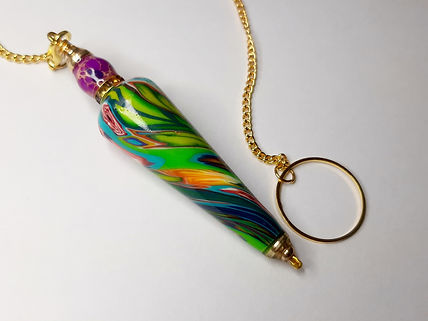 He makes most of his pendulums with coloured polymer clay, resin, rhinestones, crystals, gold and silver leaf and gold and silver plated chains.